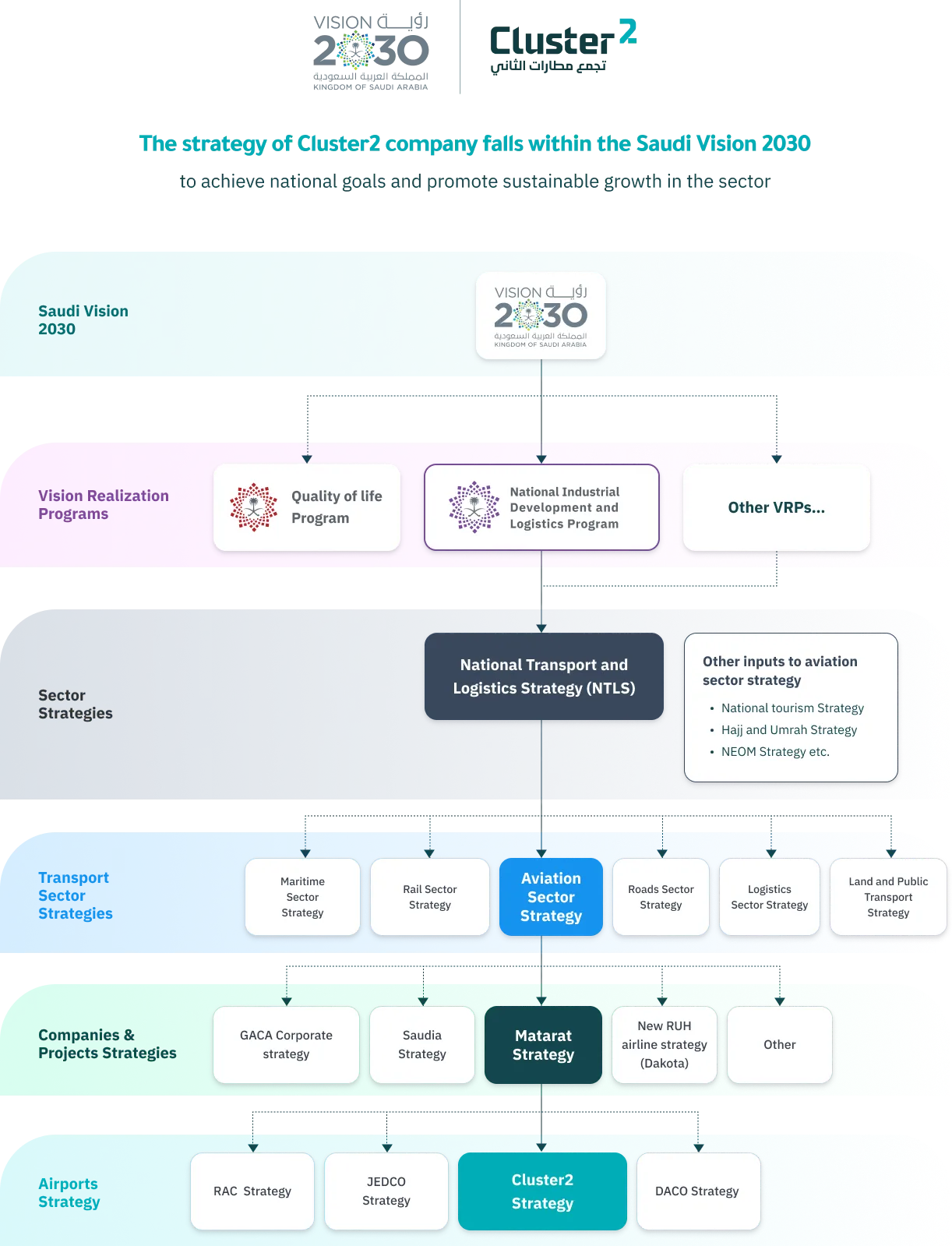 Cluster2 company was established in January 2022, marking a pivotal step in the development of the Saudi airports sector. The company manages and operates 22 airports, including domestic and international airports. The company aims to build an advanced network of airports that supports tourism and enhances services quality and operational efficiency to achieve the Saudi Vision 2030 by developing airports and enhancing the investment opportunities.
